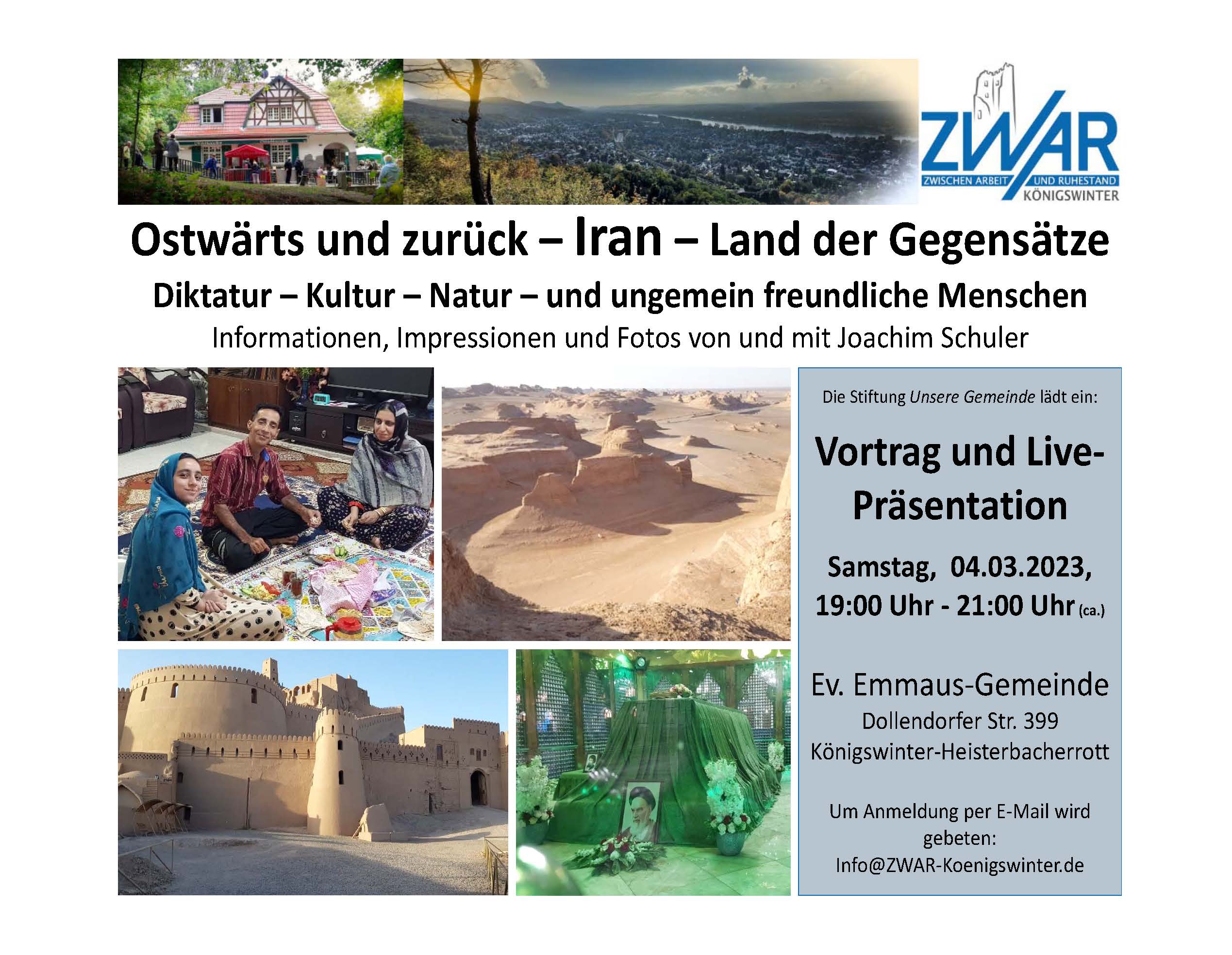 Der Vortrag findet am Samstag, den 04.03.2023, ab 19:00 Uhr in der Ev. Emmaus-Gemeinde, Dollendorfer Str. 399, in Königswinter-Heisterbacherrott statt. Achtung: Die Veranstaltung findet in der Dollendorfer Straße 399 statt (Emmauskirche) und nicht in 299, wie in einigen Veröffentlichungen angegeben.