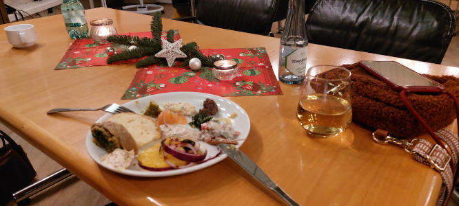 Insgesamt 22 Personen brachten Essen und Getränke für den eigenen Bedarf und darüber hinaus mit und alles wurde auf 4 großen Tischen stilvoll angerichtet. Als Kümmerer hatten Marlies und Harald auch die passende Dekoration für die Tische organisiert und diese entsprechend schön geschmückt. So konnte die Feier pünktlich um 17:30 Uhr beginnen, nachdem sich schon viele Einzelgespräche in Gruppen gebildet hatten. Im Laufe des Abends rochierten viele Teilnehmer innerhalb der Tische, so das sich ein tolles Miteinander ergeben hat. Essen und Getränke waren genug vorhanden, die Stimmung war zuversichtlich, dass wir im Jahr 2026 genau soviel Spaß in der Gruppe haben werden, wie in 2025.