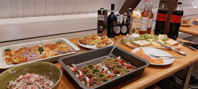 Insgesamt 22 Personen brachten Essen und Getränke für den eigenen Bedarf und darüber hinaus mit und alles wurde auf 4 großen Tischen stilvoll angerichtet. Als Kümmerer hatten Marlies und Harald auch die passende Dekoration für die Tische organisiert und diese entsprechend schön geschmückt. So konnte die Feier pünktlich um 17:30 Uhr beginnen, nachdem sich schon viele Einzelgespräche in Gruppen gebildet hatten. Im Laufe des Abends rochierten viele Teilnehmer innerhalb der Tische, so das sich ein tolles Miteinander ergeben hat. Essen und Getränke waren genug vorhanden, die Stimmung war zuversichtlich, dass wir im Jahr 2026 genau soviel Spaß in der Gruppe haben werden, wie in 2025.